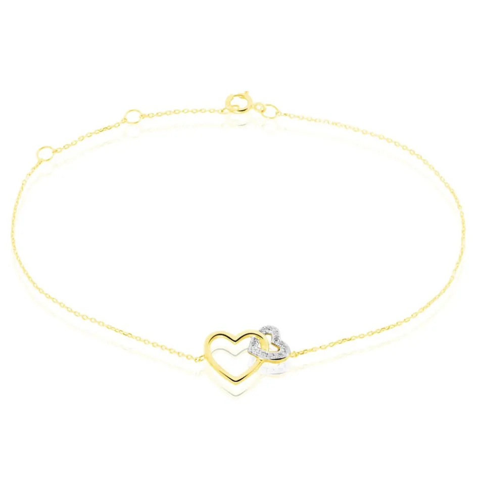 Bracelet Or Jaune 375/1000 Forme Double C艙ur Maille Forçat Pavage Diamants Micro Setting 18.5cm