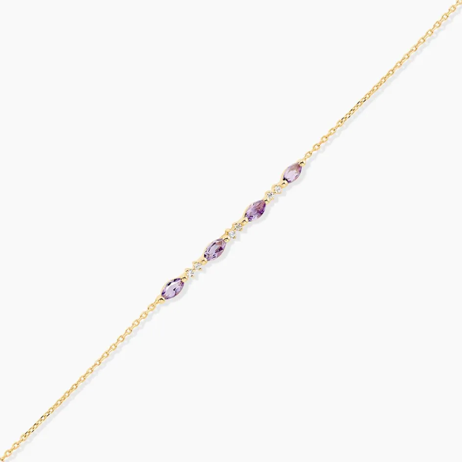 Bracelet Or Jaune 375/1000 Amethyste Navettes Sertis 2 Griffes Accompagnees D’Oxydes De Zirconium Maille Forcat 16+2Cm
