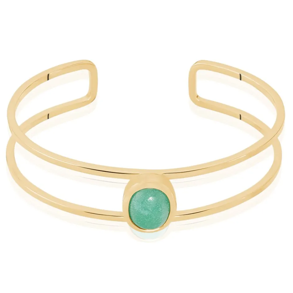 Bracelet Jonc Plaqué Or Jaune Ouvert Avec Aventurine Ovale Verte Serti Clos Diametre 58mm