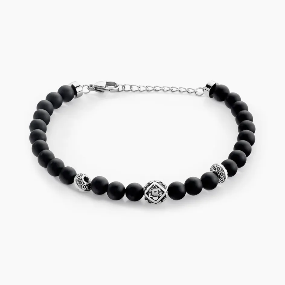Bracelet Acier Inoxydable Gris Boules Pierres Agates Noires 22cm