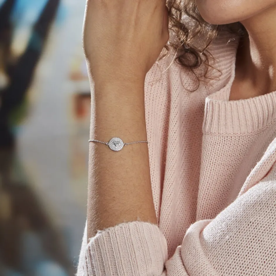 Bracelet Argent 925/1000 Pastille C艙ur Maille Forçat Pavage Oxydes De Zirconium 18.5cm