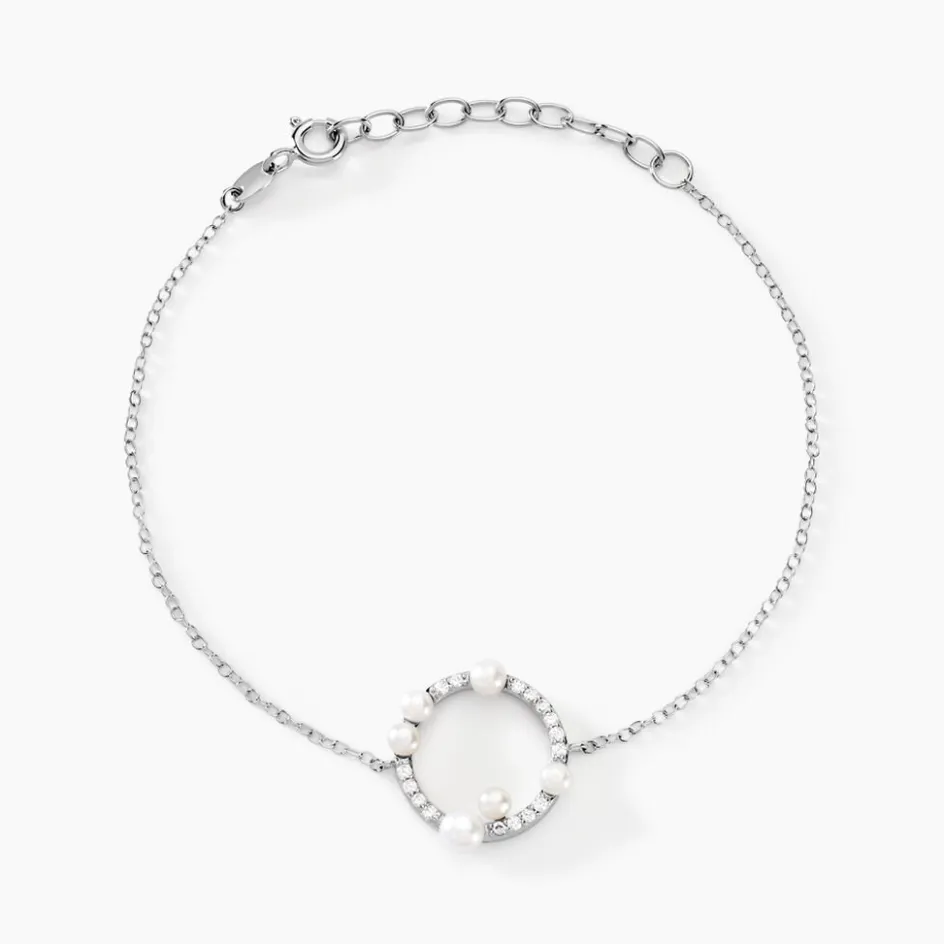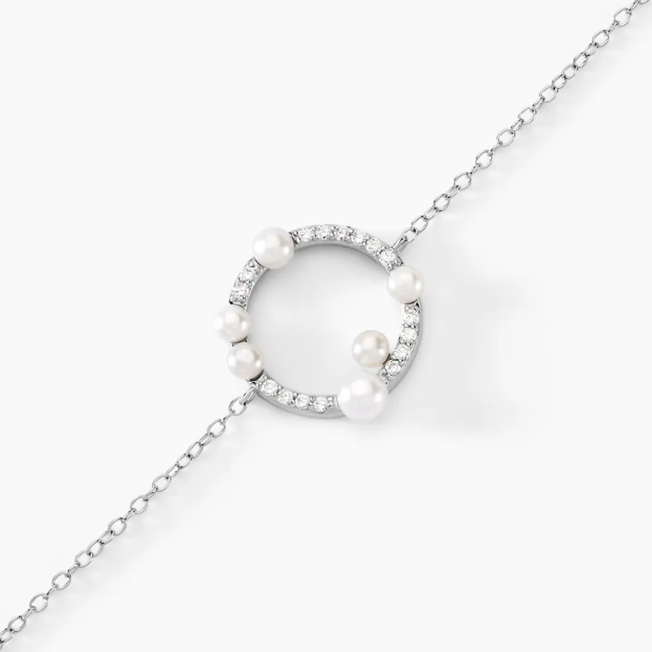 Bracelet Argent Blanc 925/1000 Cercle Ajouré Perles De Culture Blanches Pavage Oxydes De Zirconium Maille Forçat 16+3cm