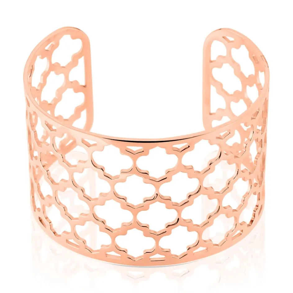 Bracelet Acier Rose Manchette Motifs Trefles Ajoures Ajustable