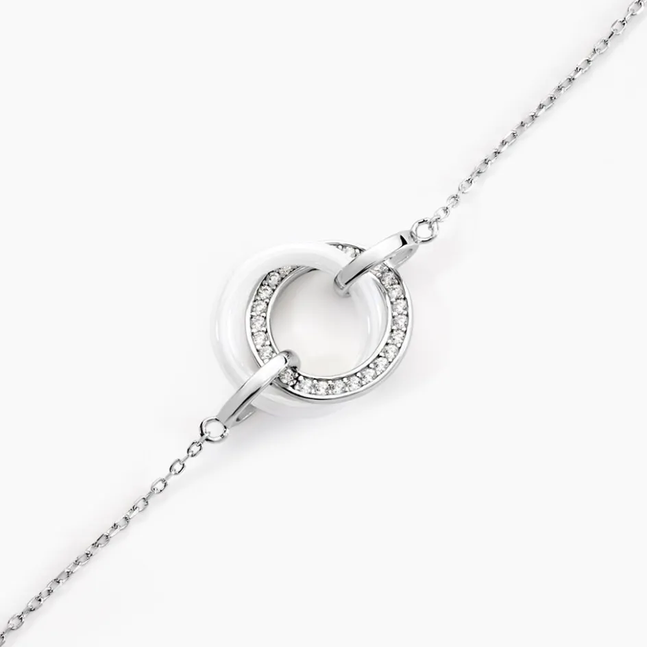 Bracelet Argent Blanc 925/1000 Céramique Blanche Ovale Pavage Oxydes De Zirconium Maille Forcat 15.5+3cm