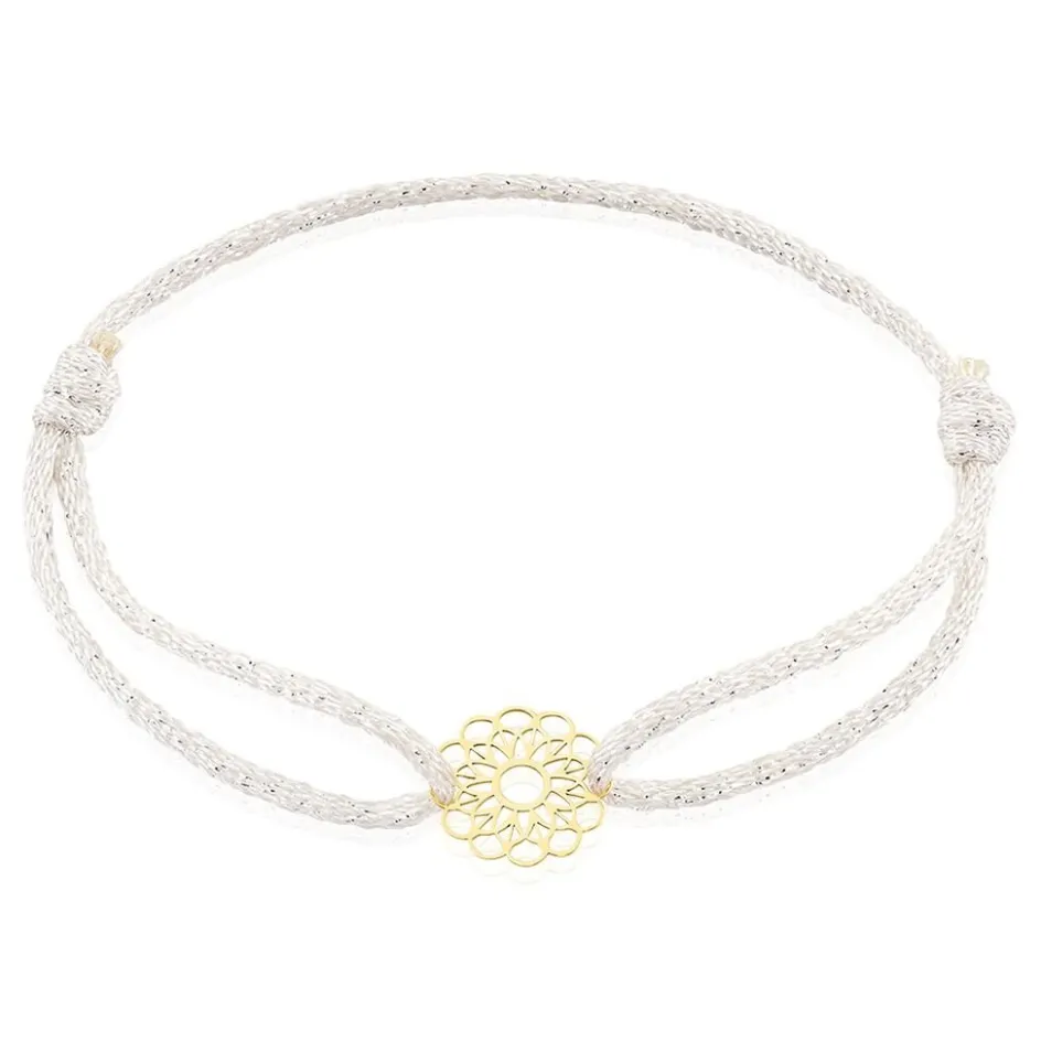 Bracelet Or Jaune 375/1000 Rosace Cordon Synthetique Ajustable Blanc Paillete Argente 18cm