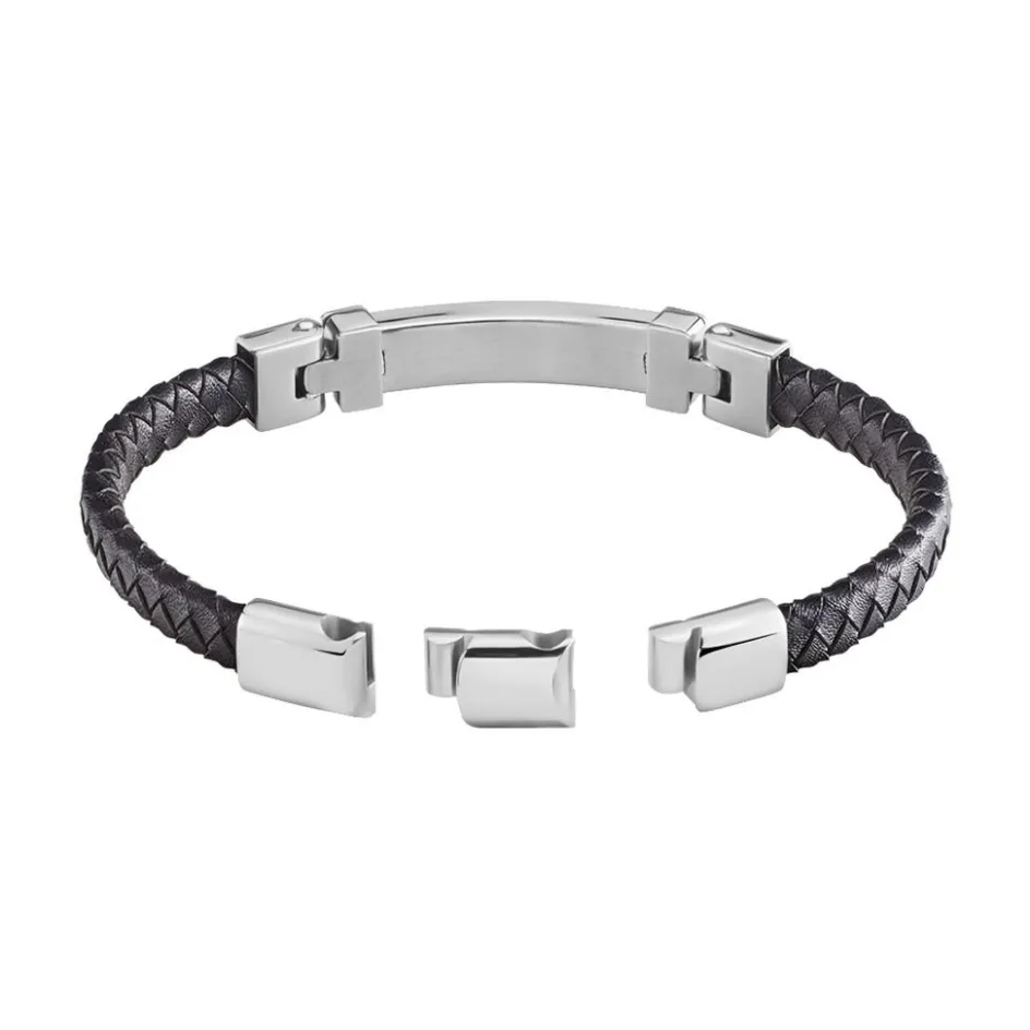 Bracelet Acier Inoxydable Blanc Cuir De Vache Noir Tressé Plaque Acier Inoxydable Ip Noir Et Cables 21cm