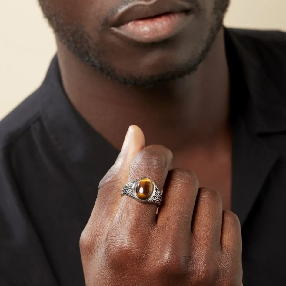 Chevaliere Acier Inoxydable Gris Vieilli Plateau Ovale 艙il De Tigre