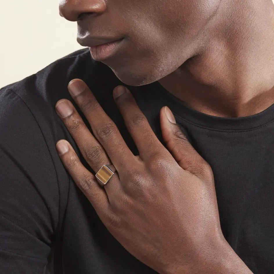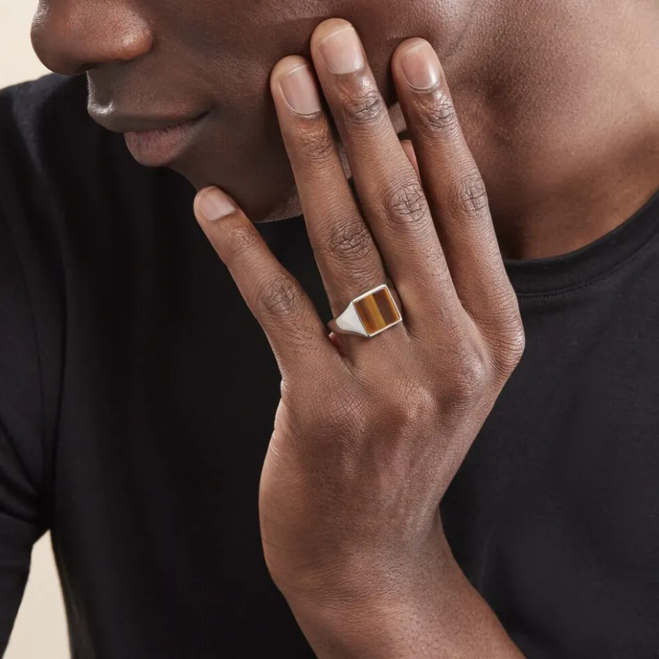 Chevalière Argent Blanc 925/1000 Forme Carré Oeil De Tigre