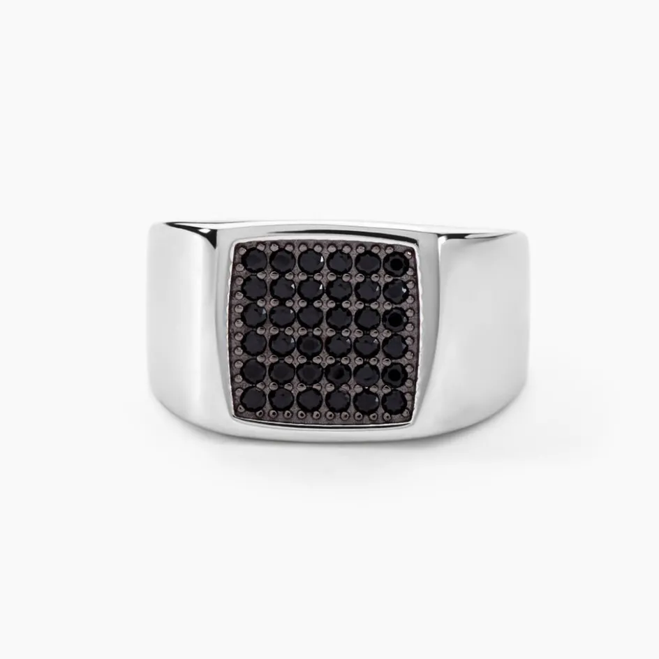 Chevaliere Argent Blanc 925/1000 Plateau Carre Oxydes De Zirconium Noirs