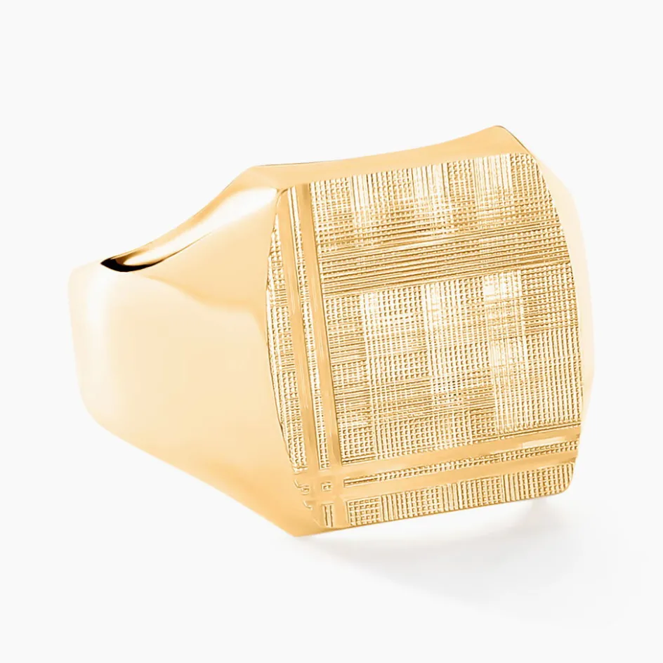 Chevalière Or Jaune 375/1000 Plateau Tonneau Effet Quadrille Brossé Avec Lisseret