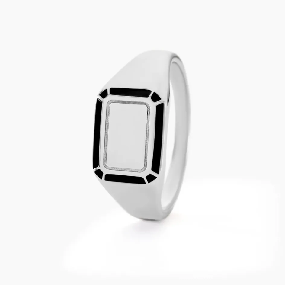 Chevalière Argent 925/1000 Forme Rectangulaire Liseret Email Noir