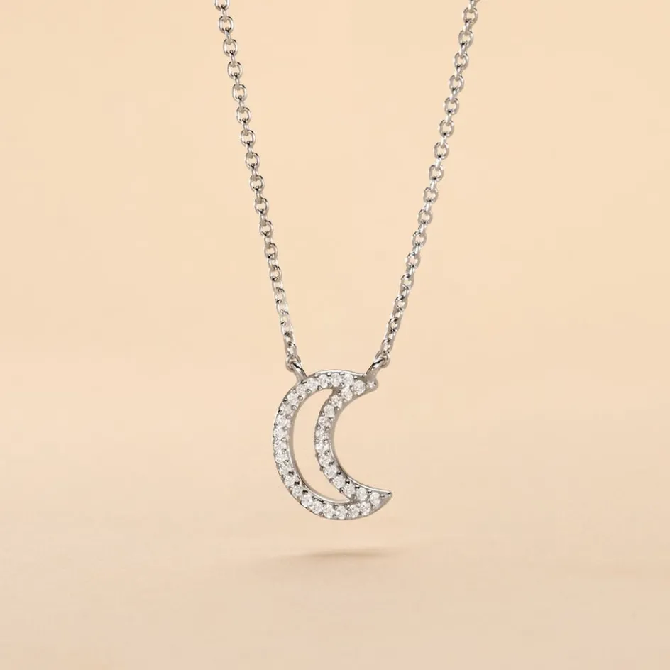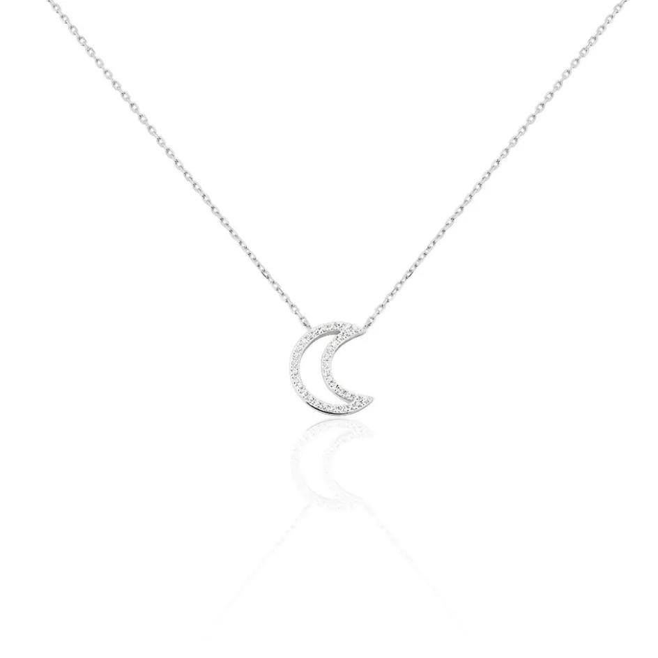 Collier Argent 925/1000 aisha Forme Lune Ajourée Pavage Oxydes De Zirconium Maille Forcat 45cm