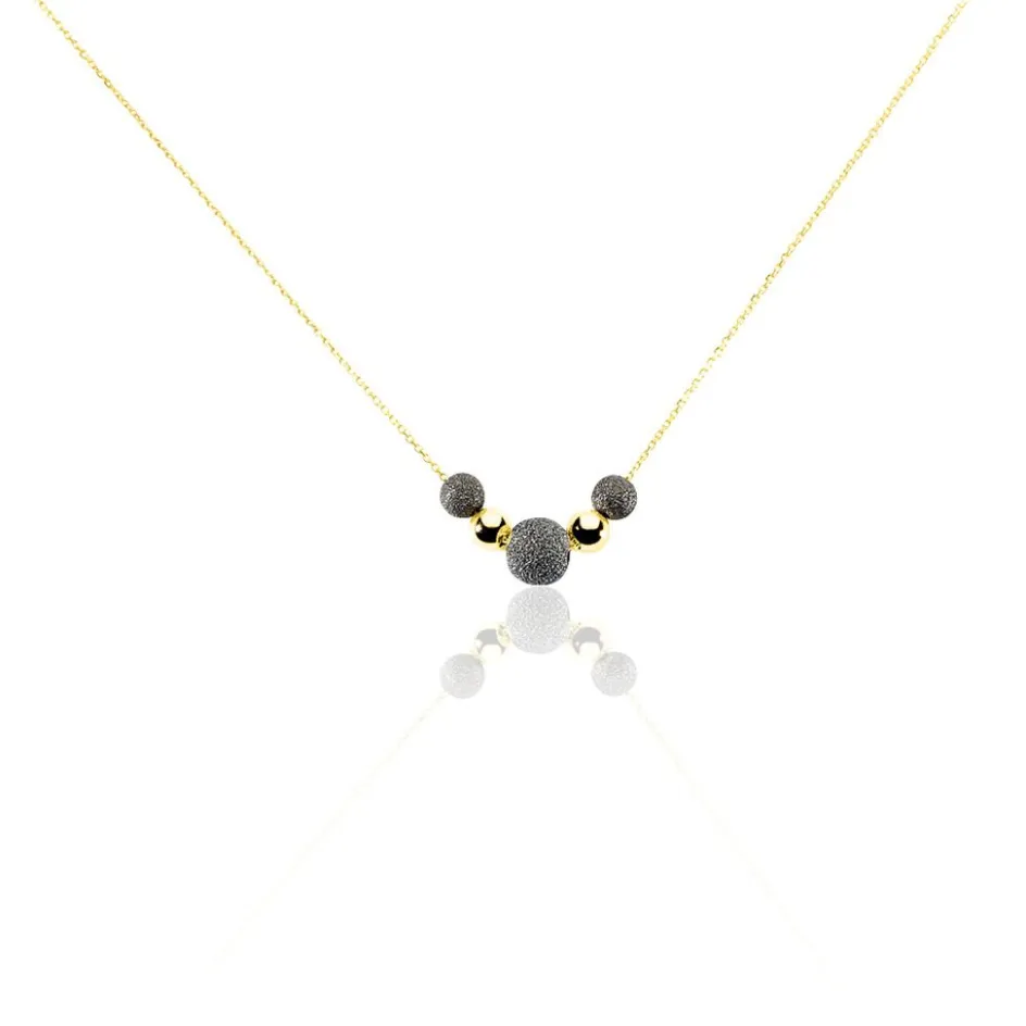 Collier Or Jaune 375/1000 2 Petites Boules Lisses + 3 Boules Sablees Noires Maille Forcat 41cm