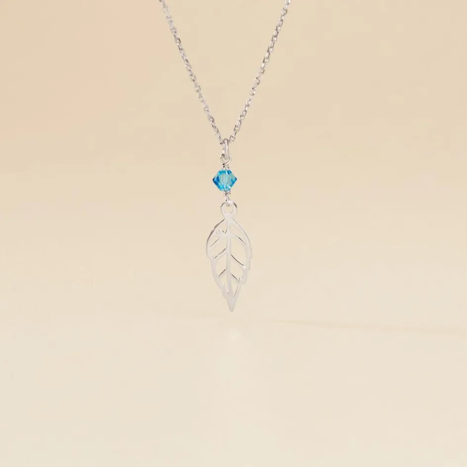 Collier Argent Blanc 925/1000 Feuille Pierres Bleues Synthetiques Maille Forçat 38cm