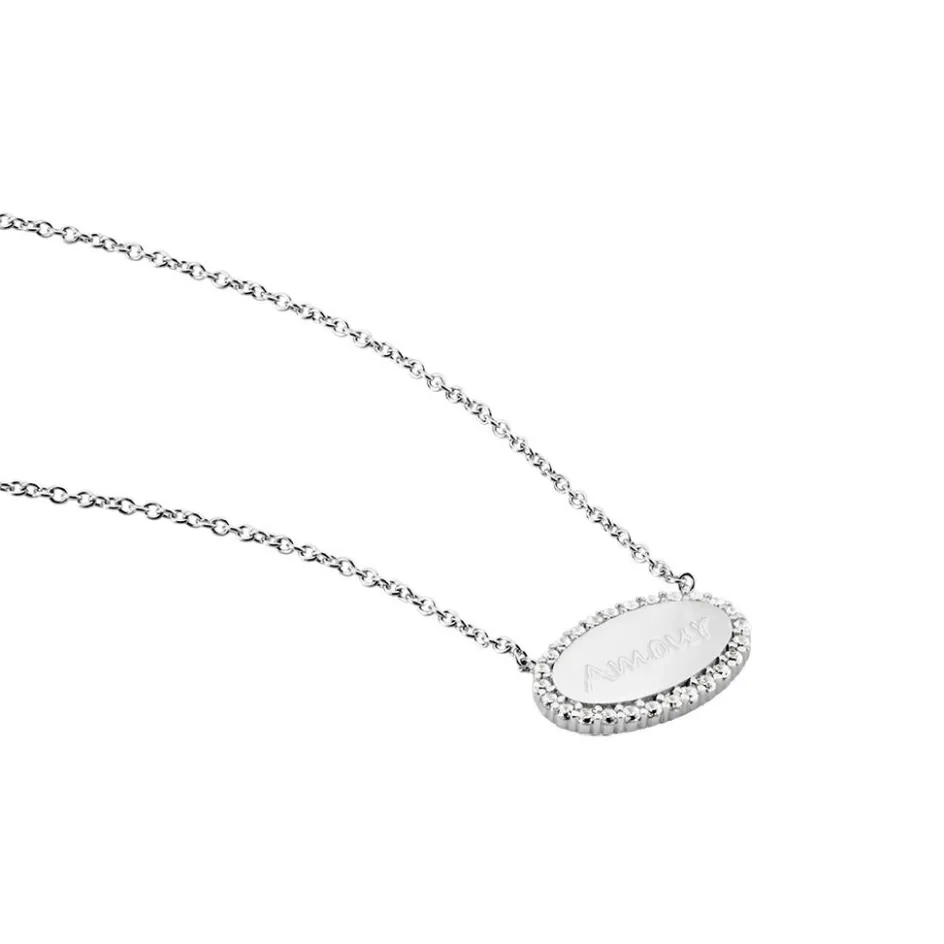 Collier Argent Blanc 925/1000 Pastille Ovale Message Amour Entourage Oxydes De Zirconium Maille Forçat 45cm