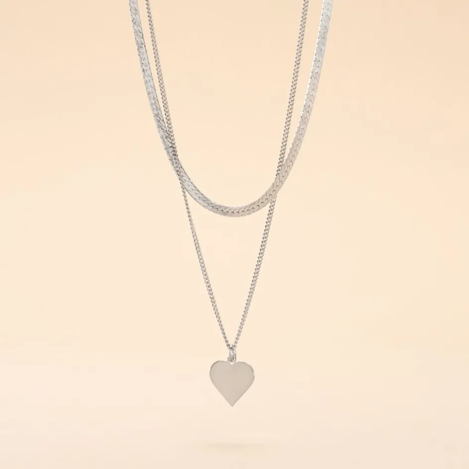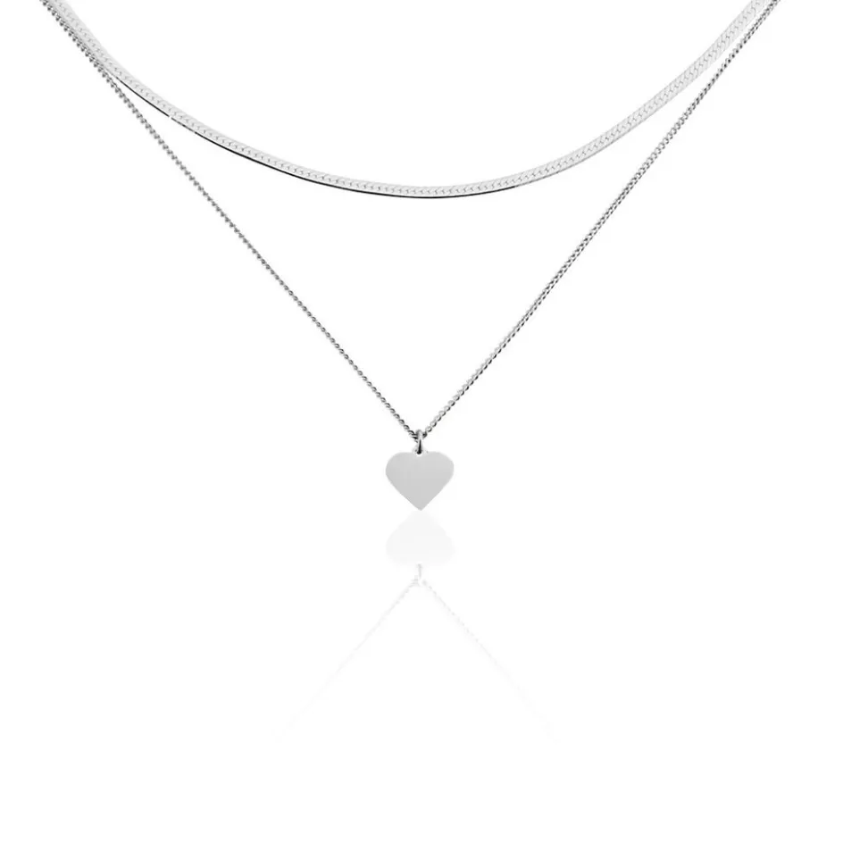 Collier Argent Blanc 925/1000 C艙ur Double Chaines Maille Serpent Et Maille Gourmette 45cm