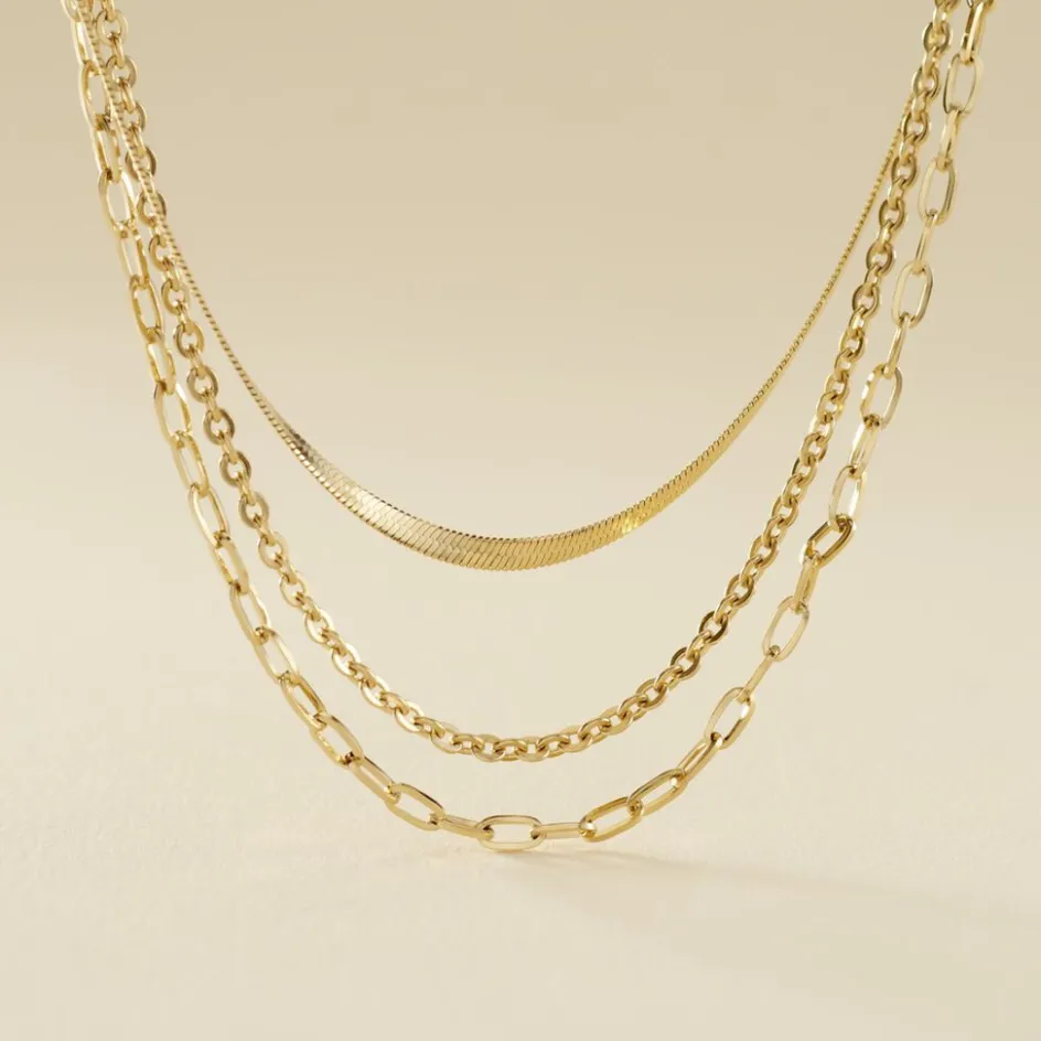 Collier Acier Inoxydable Jaune Triple Chaînes Miroir Cheval Et Forçat Ronde Largeur 7.4mm 42cm