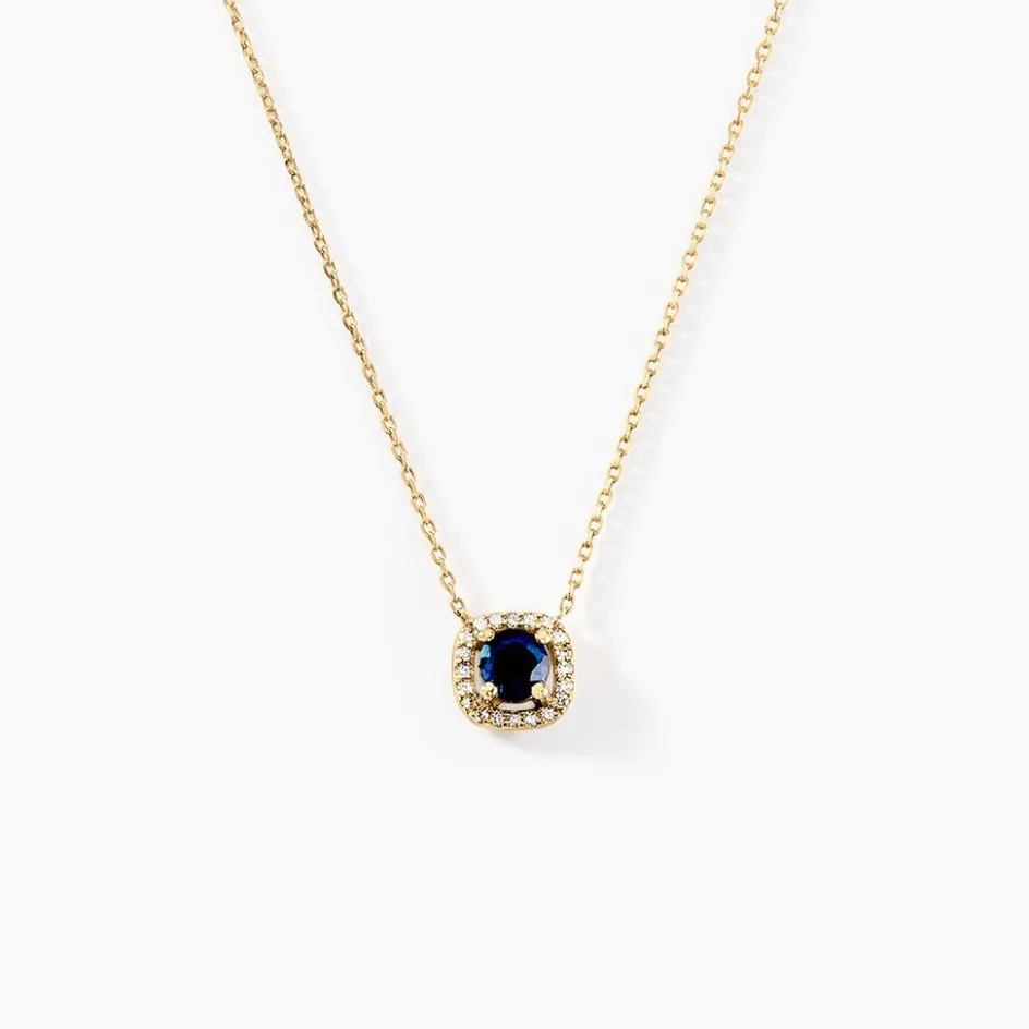 Collier Or Jaune 375/1000 Saphir 0.33cts Serti Griffes Entourage Diamants Maille Forcat 40+2cm