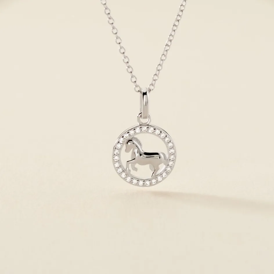 Collier Court Argent Blanc 925/1000 Motif Cheval Oxyde De Zirconium Serti Griffes Maille Forcat 38cm