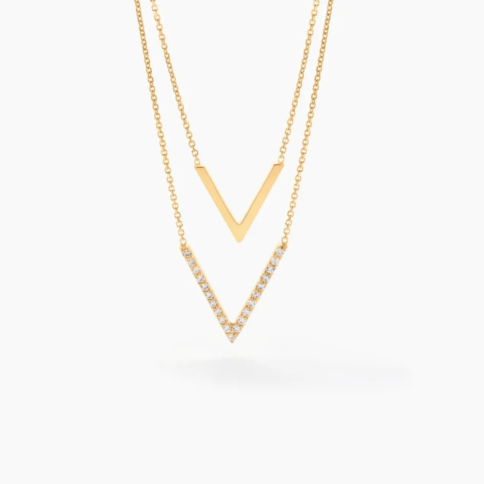 Collier Or Jaune 375/1000 Doubles Chaines Formes V Oxydes De Zirconium 42 Cm