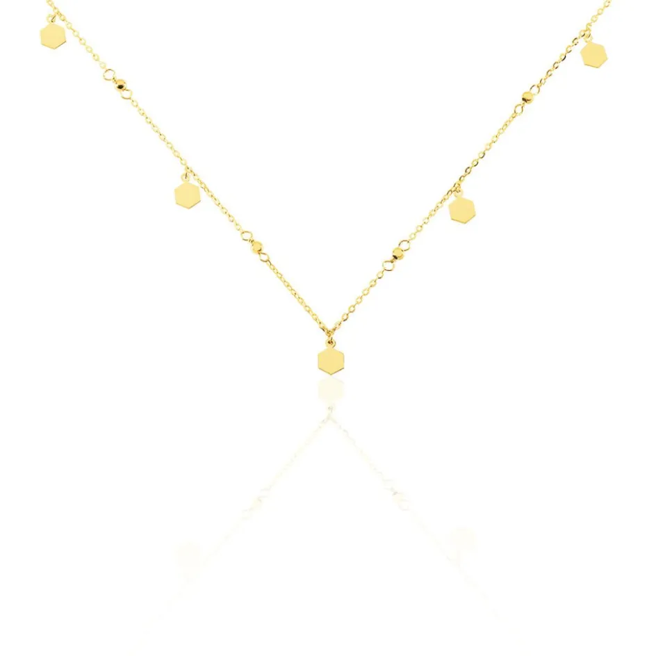 Collier Or Jaune 375/1000 Motifs Hexagones Pendants + Petites Boules Or Maille Jaseron 42cm