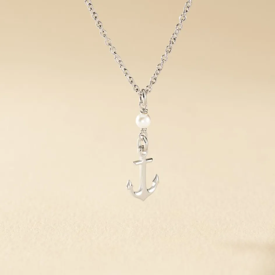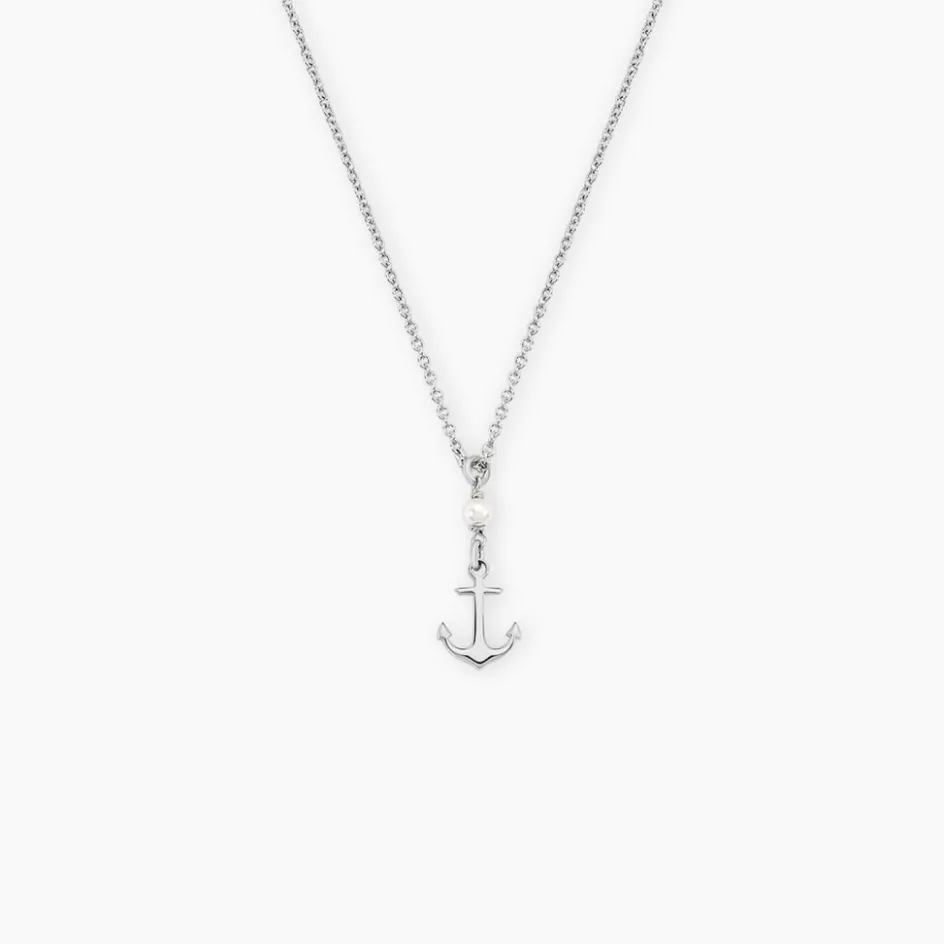 Collier Argent Blanc 925/1000 Ancre Marine Et Perle D’imitation Maille Forcat 45cm