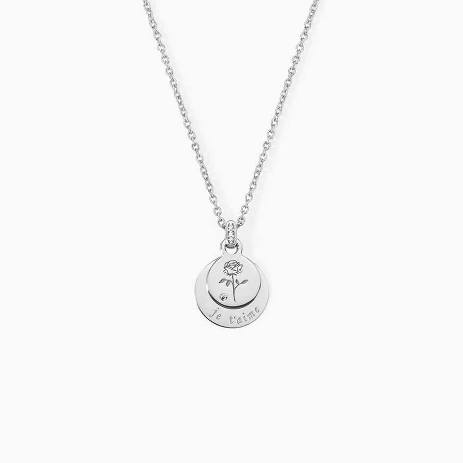 Collier Argent 925/1000 Double Pastille Rose Et Message Je T’aime Maille Forçat Sertis Oxydes De Zirconium 45cm