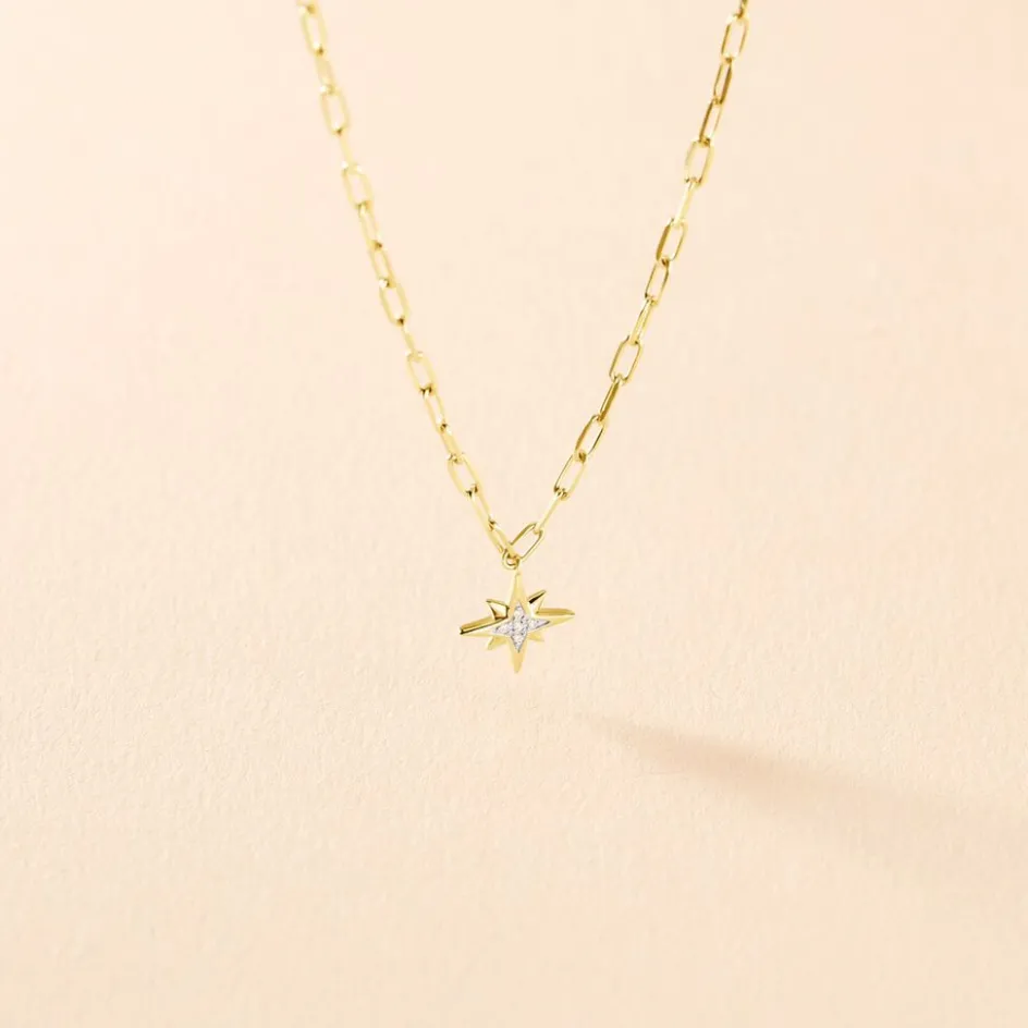 Collier Or Jaune 375/1000 Motif Etoile Diamants 0.028cts Micro Serti Maille Cheval 40+2cm
