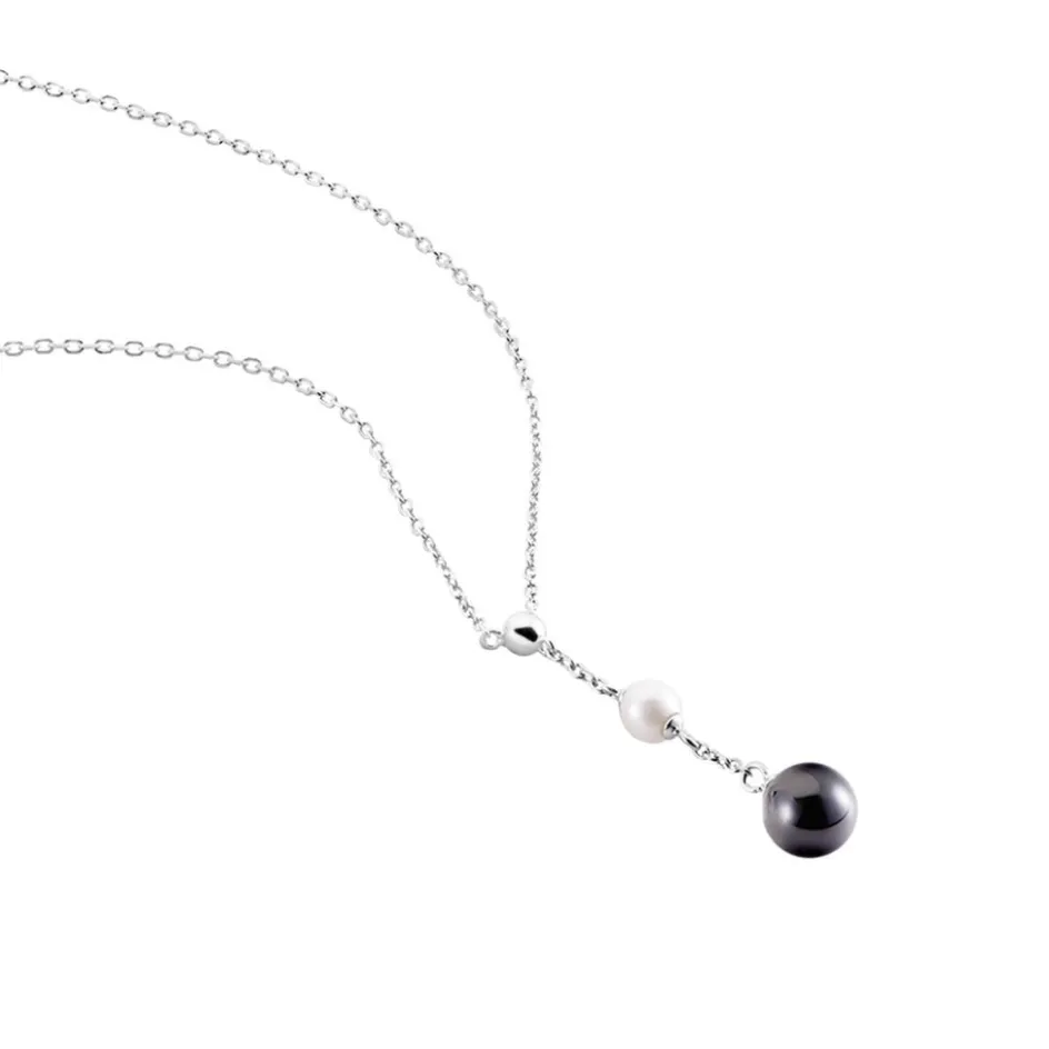 Collier Argent Blanc 925/1000 Perles De Culture Et Boule Ceramique Noire Maille Forcat 45cm