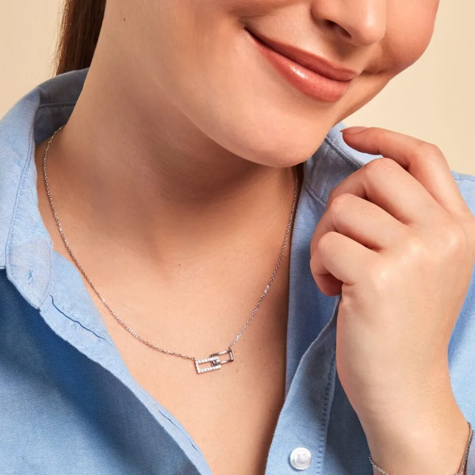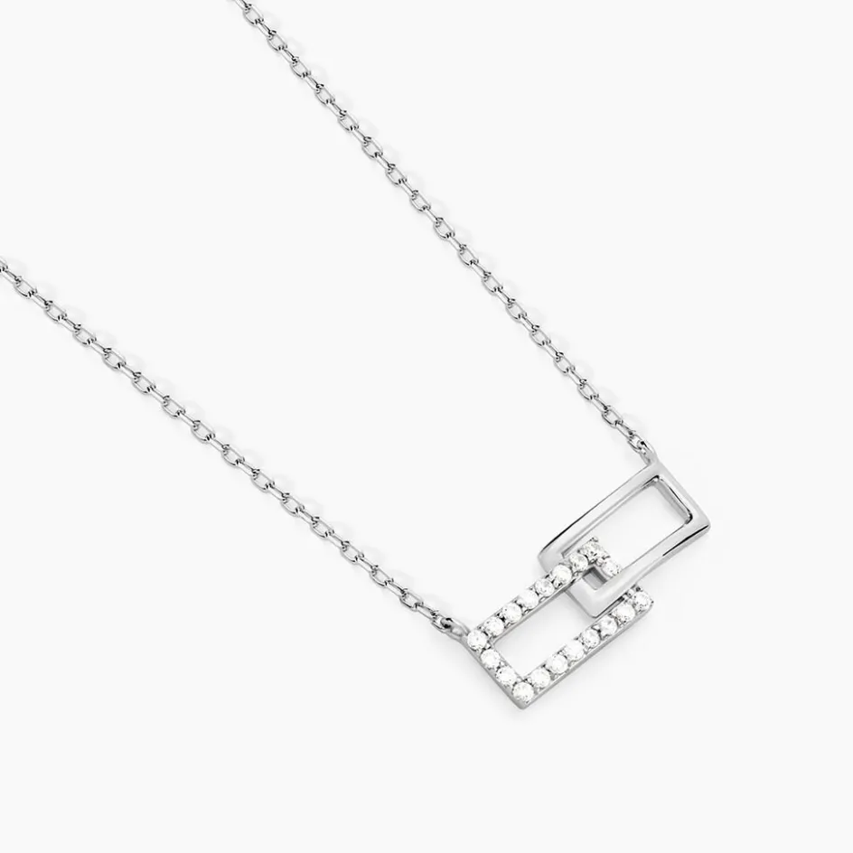 Collier Argent Blanc 925/1000 Double Rectangle Pavage Oxydes De Zirconium Maille Forçat 45cm