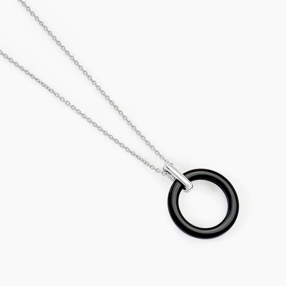 Collier Argent Blanc 925/1000 Cercle Ceramique Noire Et Barrettepavee Oxydes De Zirconium 45cm