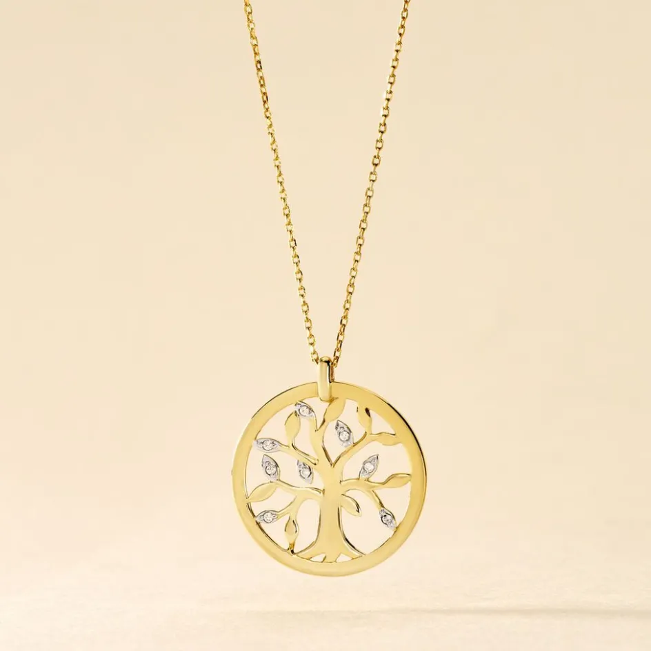 Collier Or Jaune 375/1000 Cercle Ajouré Arbre De Vie Pavage Diamants Maille Forçat 40+2cm