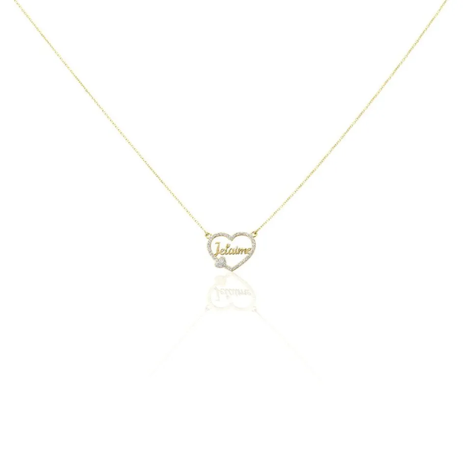 Collier Or Jaune 375/1000 Double C艙urs Glitter Argente Message Je T’aime Maille Jaseron 40+2cm