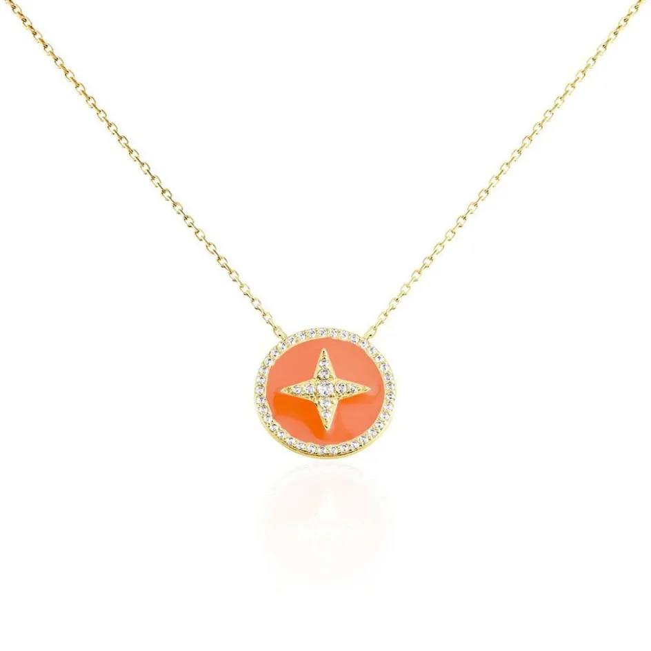 Collier Or Jaune 375/1000 Pastille Email Corail Etoile Du Berger Pavage Oxyde De Zirconium Chaine Maille Forcat 40+2cm