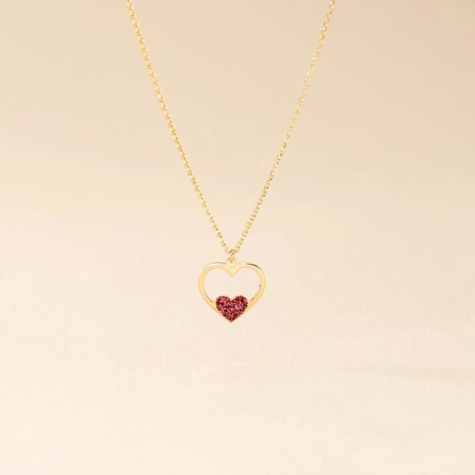 Collier Or Jaune 375/1000 Double Coeurs Glitter Rose Maille Jaseron 36/38cm