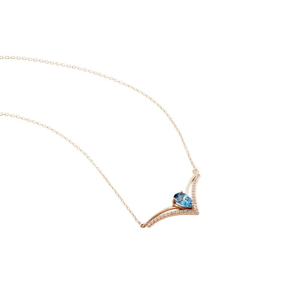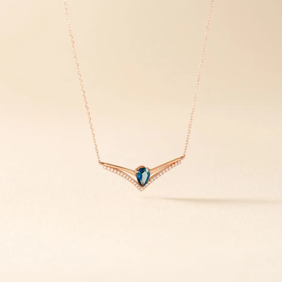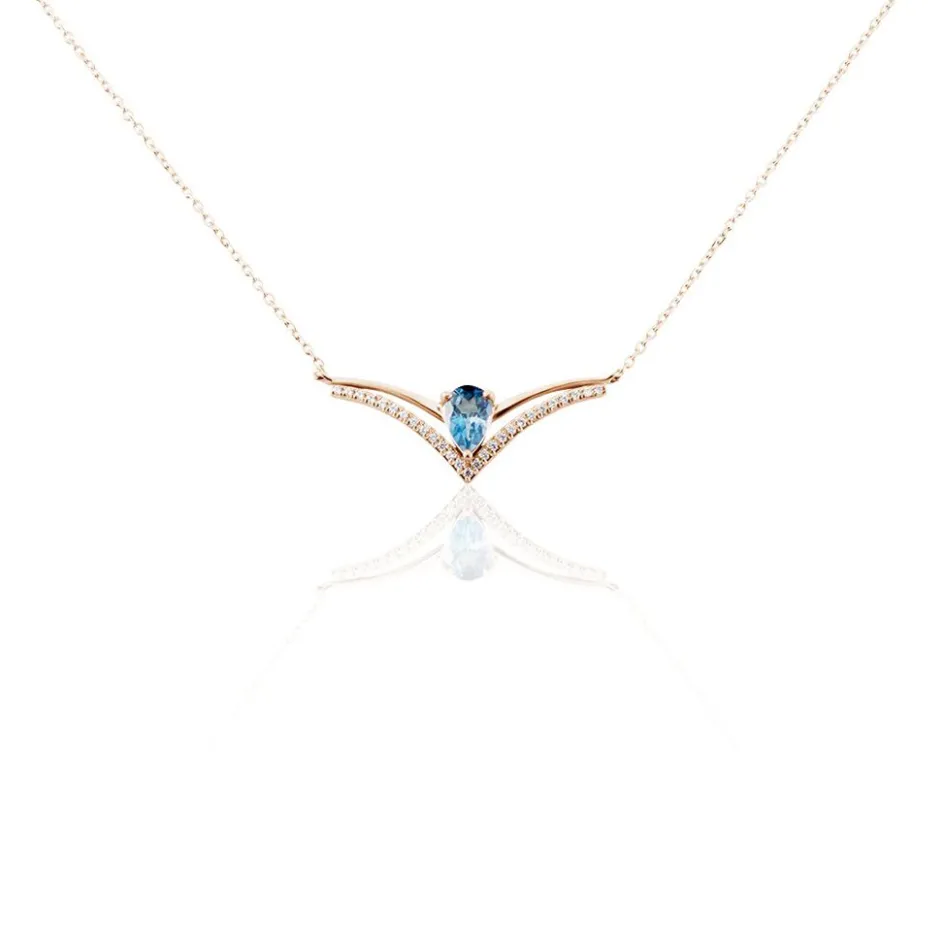 Collier Or Rose 375/1000 Forme Aile De Mouette London Blue Topaze 0.48ct Pavage Oxydes De Zirconium 42cm