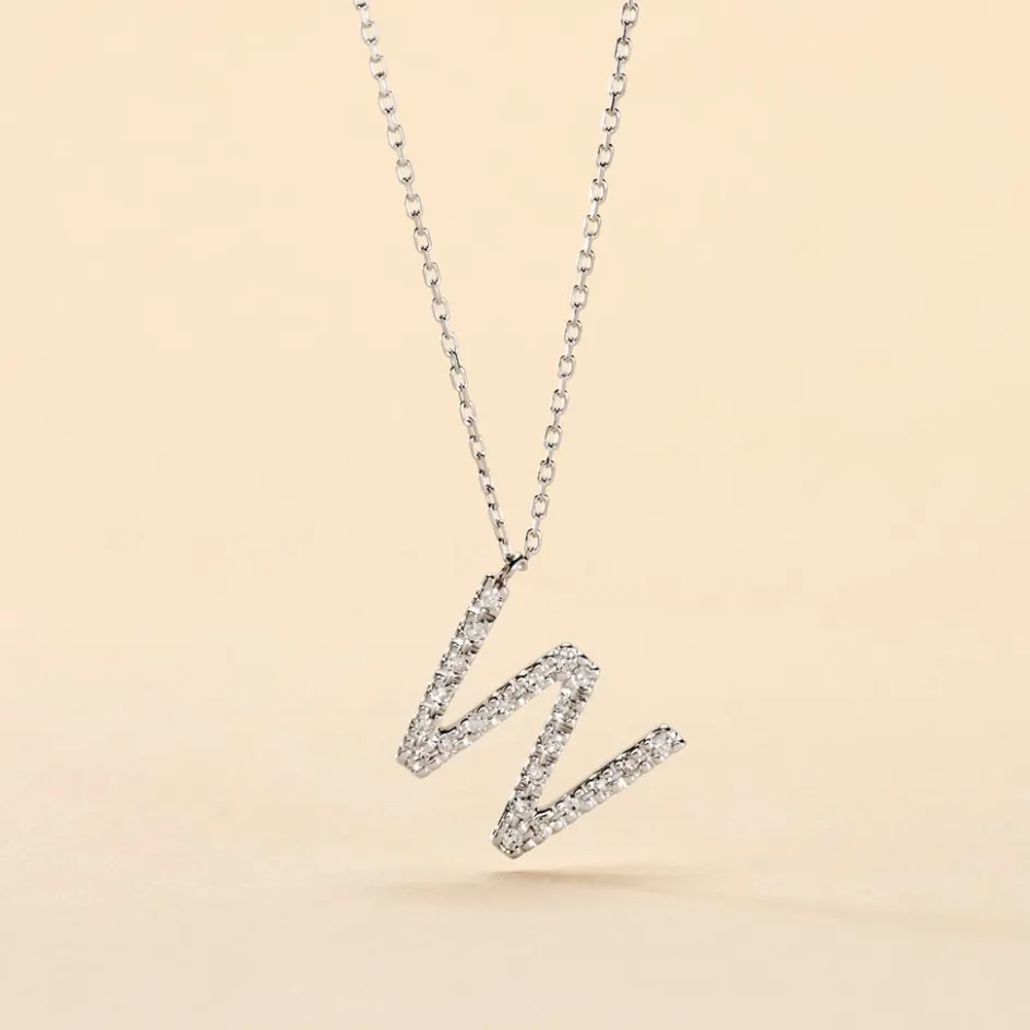 Collier Or Blanc 375/1000 Lettre W Pavage Diamants Maille Forçat 42cm