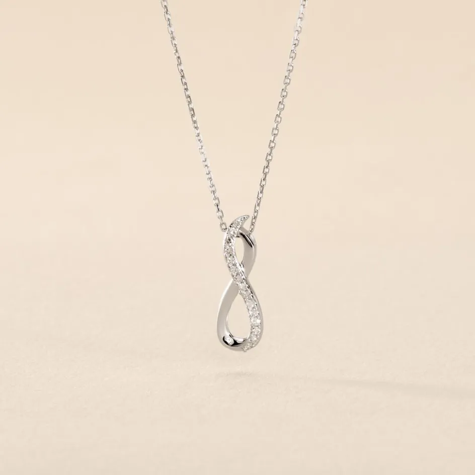 Collier Or Blanc 375/1000 Pendentif Forme Infini Pavage Diamants 42cm