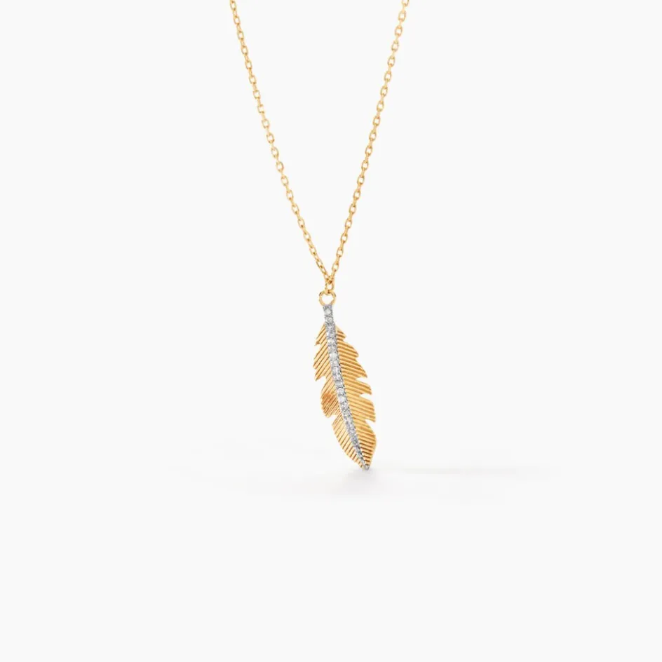 Collier Or Jaune 375/1000 Forme Plume + Pavage Diamants 42cm