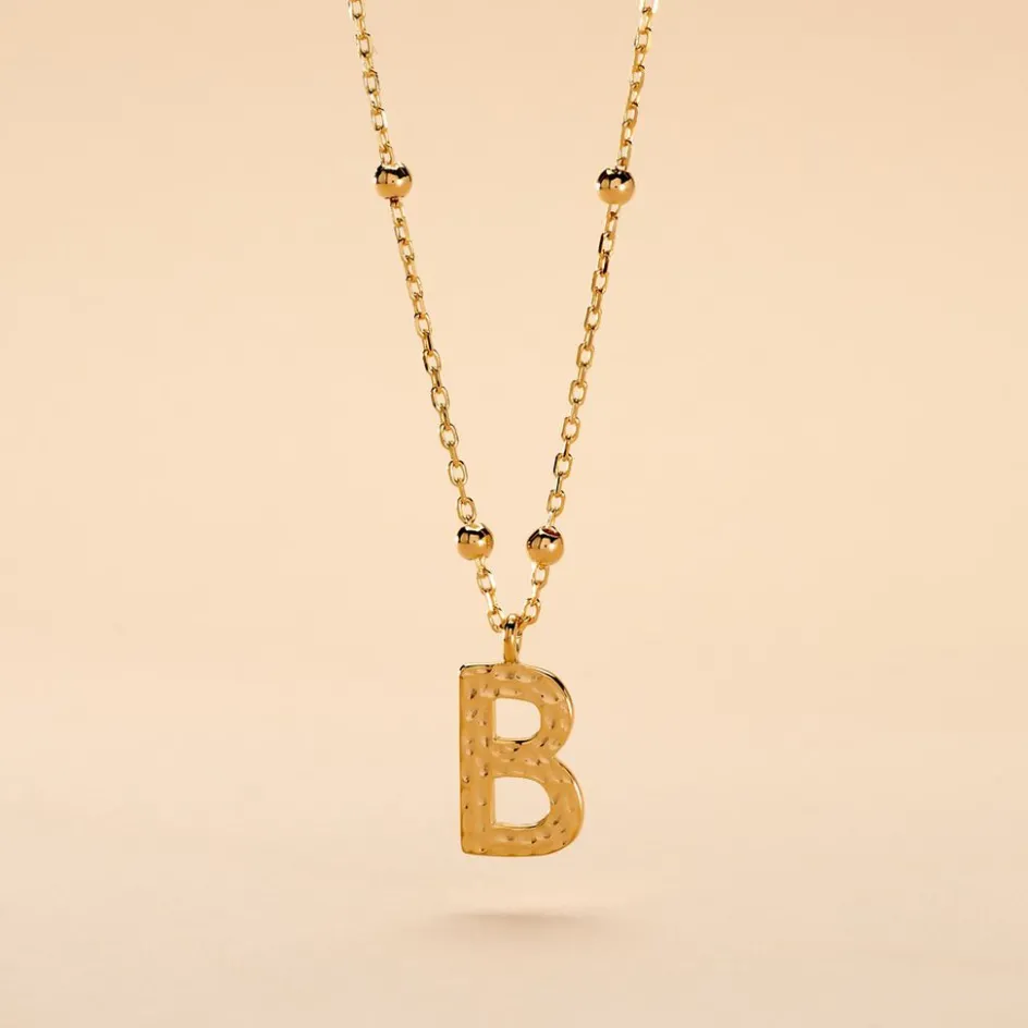 Collier Plaque Or Jaune Lettre B Martelee Et Petites Boules Chaine Maille Forcat Longueur 45cm