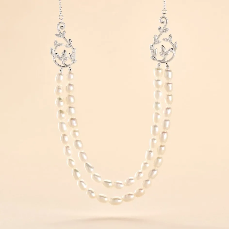 Collier Double Rang Argent Blanc 925/1000 Perles Naturelles D’eau Douce Micro Setting Oxydes De Zirconium 53cm