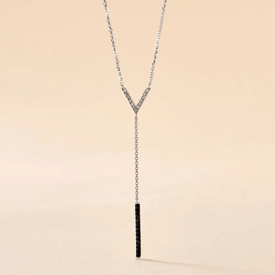 Collier Or Blanc 375/1000 Forme V Cravate Diamants Noirs Et Diamants Blancs 42cm