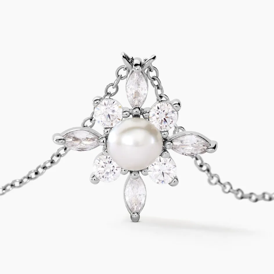Collier Argent Blanc 925/1000 Flocon Perle De Culture Et Oxydes De Zirconium Maille Forçat 42+3cm