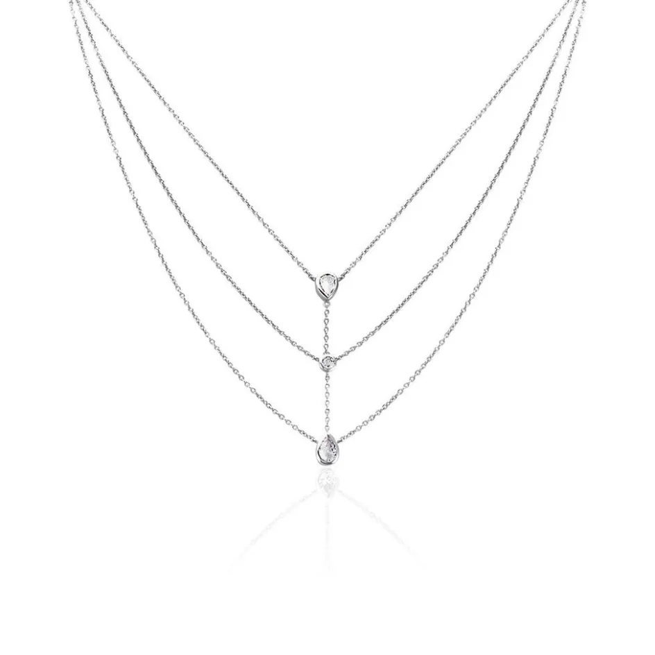Collier Argent Blanc 925/1000 Triple Chaine Goutte Et Cercle Oxydes De Zirconium Maille Jaseron 38+2cm