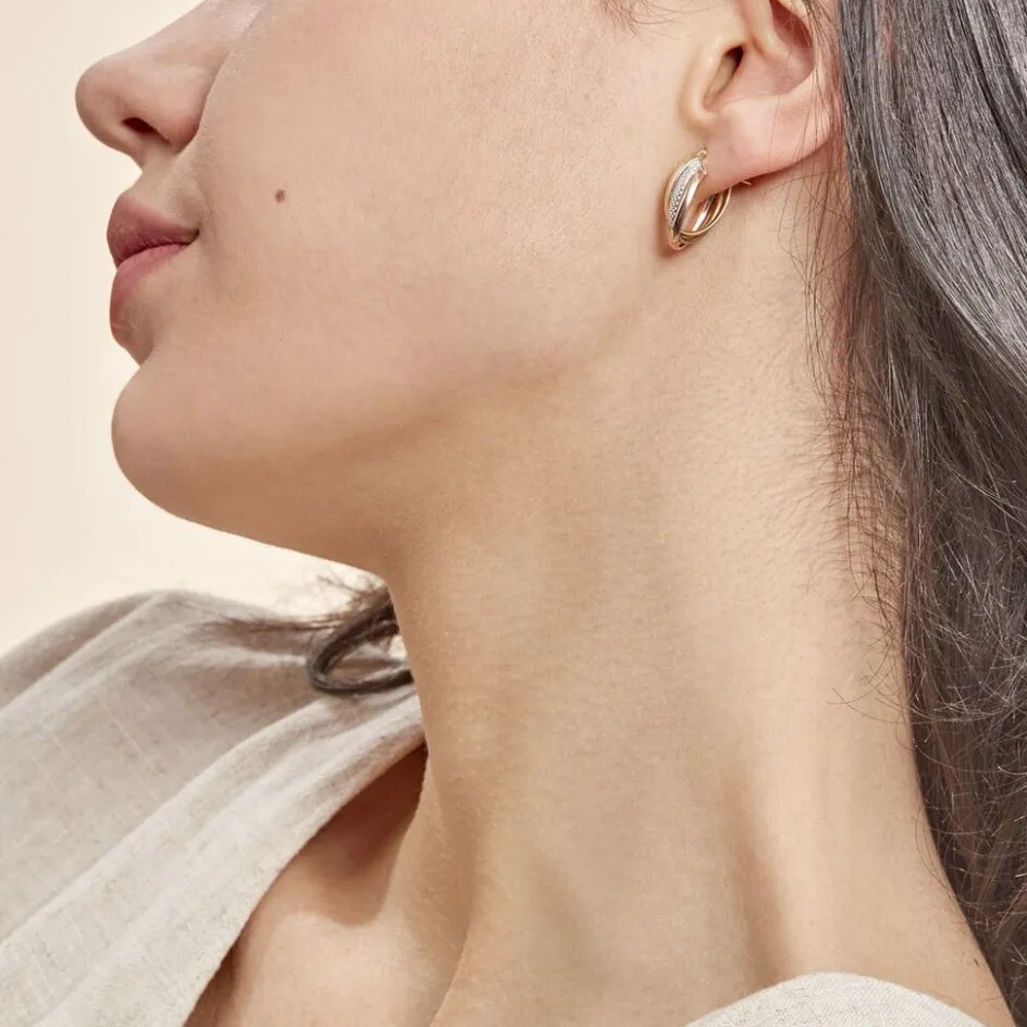 Créoles Or Tricolore 375/1000 Trois Fils Demi Jonc Dont 1 Fil Effet Diamanté Largeur 1.8mm Diamètre 14x10mm
