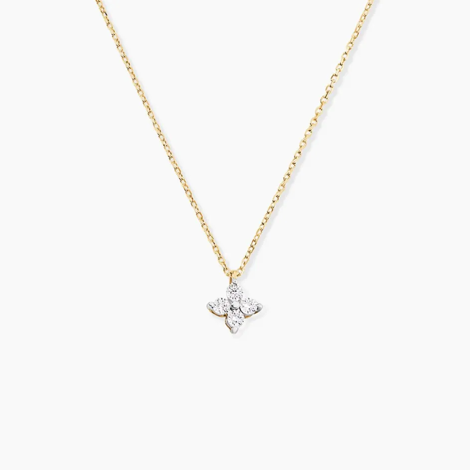 Collier Or Jaune 375/1000 Fleur Diamants Ronds Maille Forcat 40+2Cm