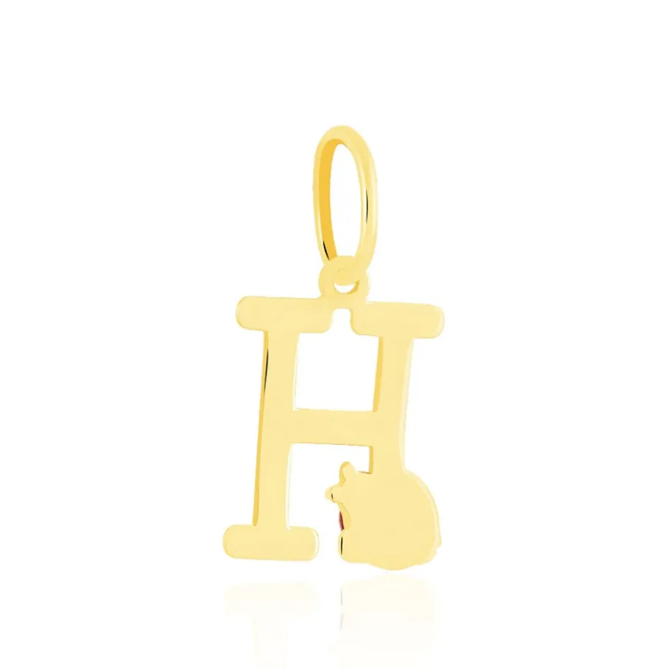 Pendentif Or Jaune 375/1000 Lettre H Motif Coccinelle Email Noir Et Rouge