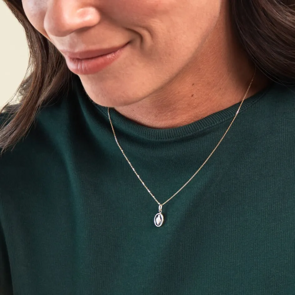 Pendentif Or Jaune 375/1000 Vierge Miraculeuse Ovale Email Noir 1.2cm
