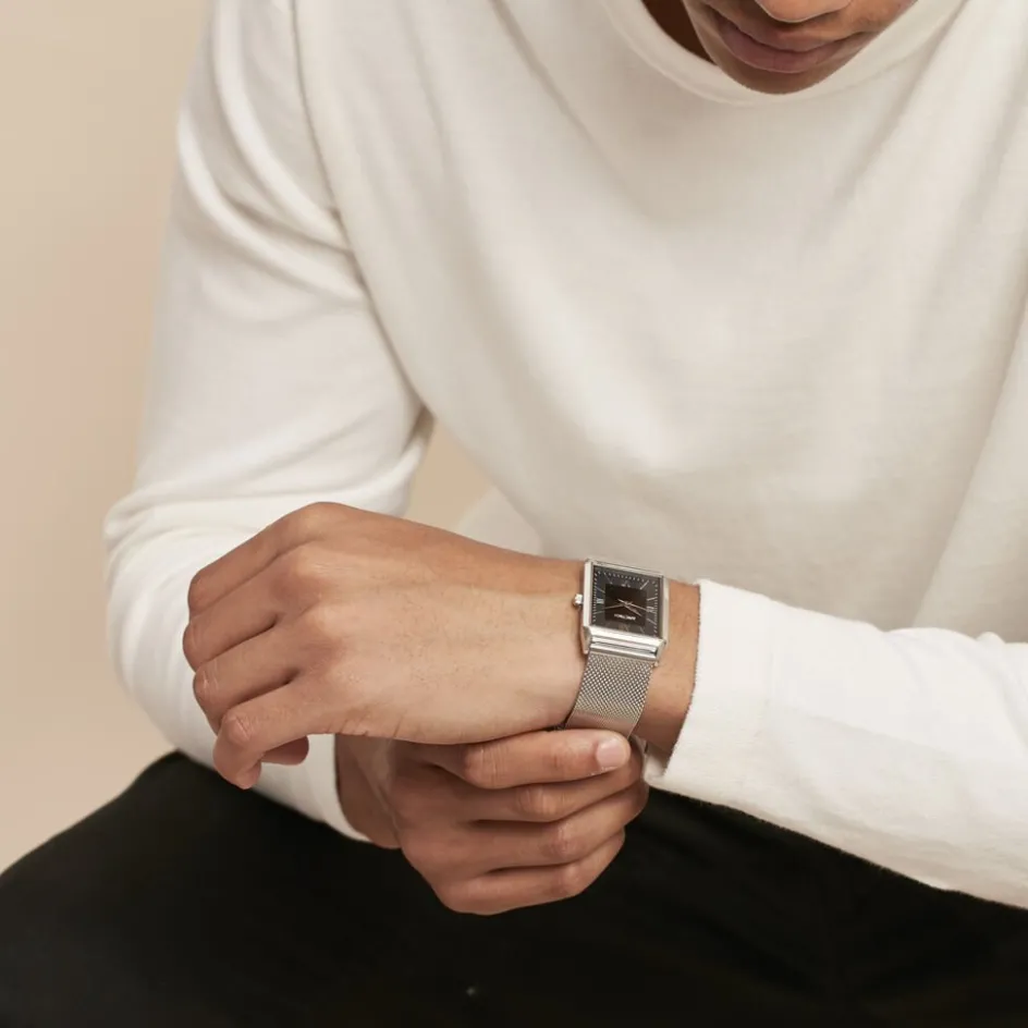 Montre Arctik Quark Acier Argenté Rectangulaire Quartz 29×40.5mm Fond Noir Bracelet Milanais Acier Argenté P101074-c