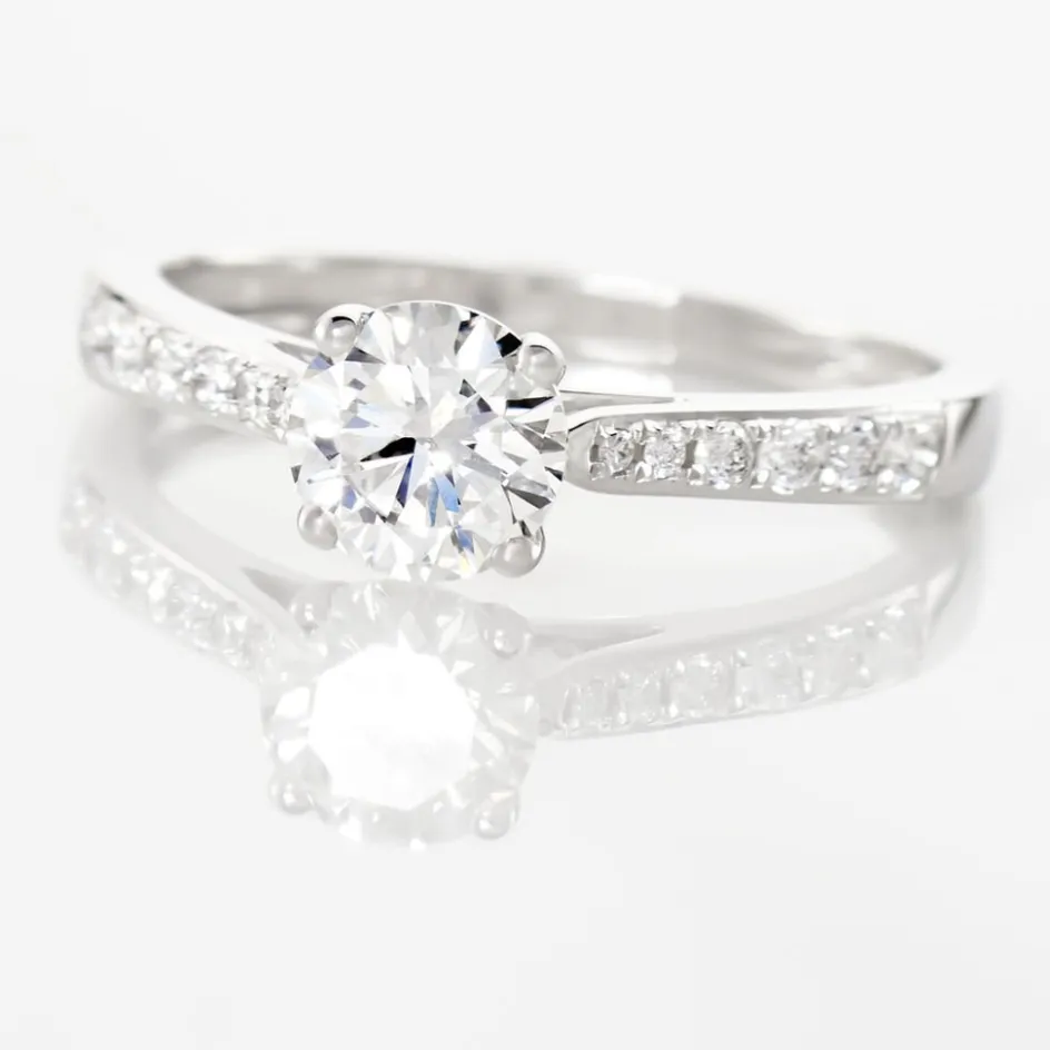 Solitaire Or Blanc 750/1000 Diamant Central Synthetique 0.80cts Serti Griffes Accompagne Diamants Synthetique